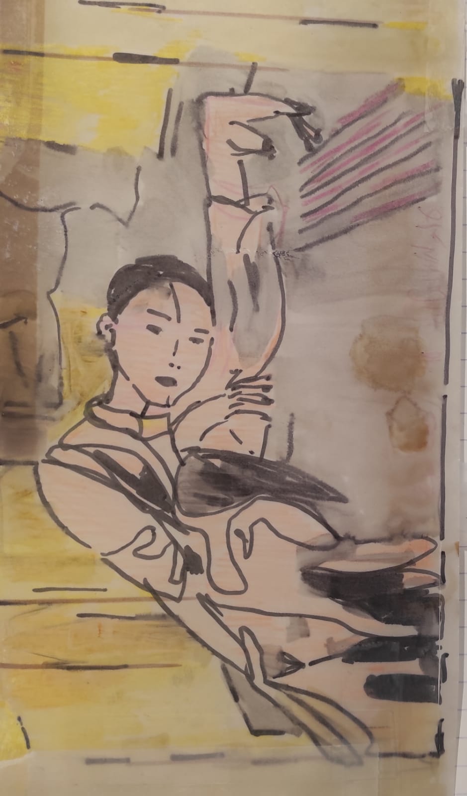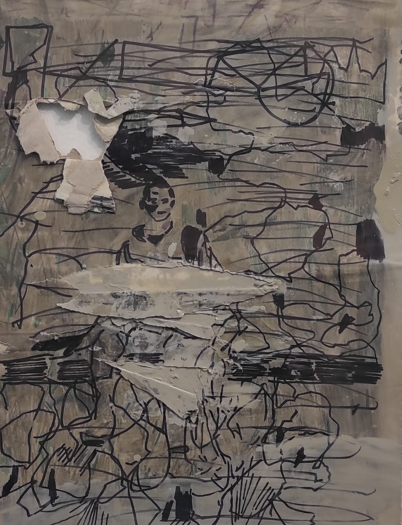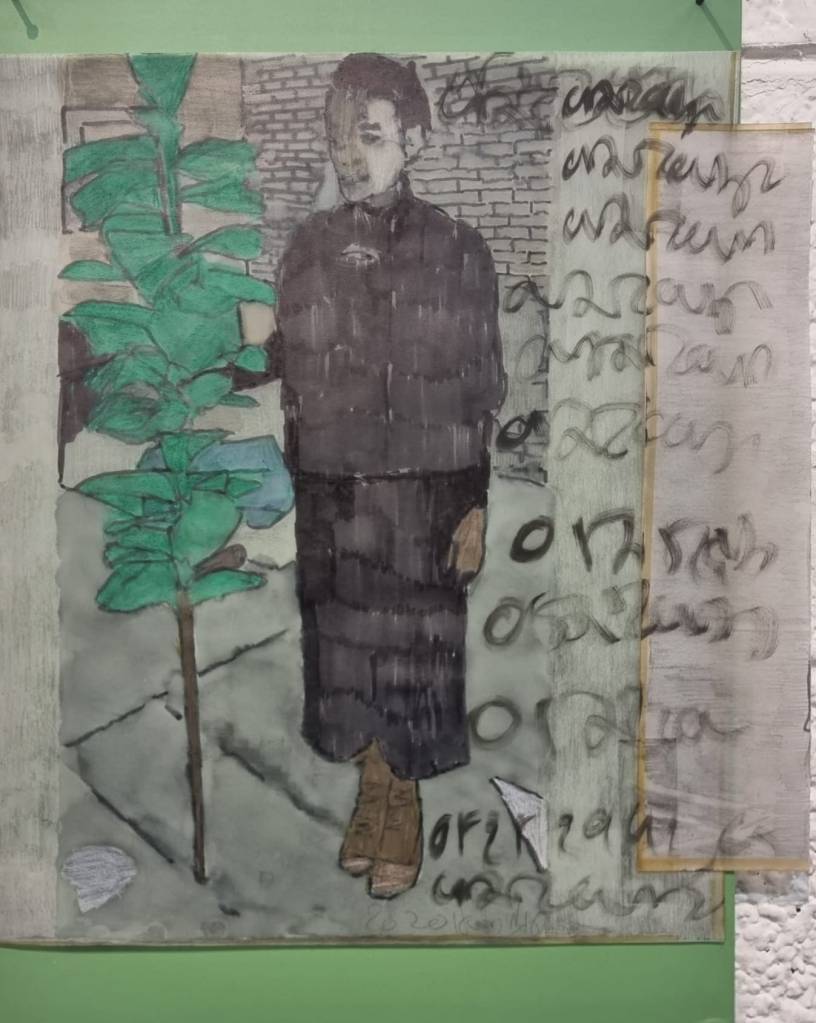 בחלק מהעבודות אני מדביקה מסקינג טייפ 'חלבי' על הנייר שבאמצעותו אני אוטמת את הנייר או הדמויות, כך שנוצר מצב שאינו מאפשר נגיעה. השקיפות היא בשל 'החלביות' אך הכיסוי השקוף גורם לדמויות להתרחק, ולמתבונן להתקרב ולנסות לגלות. מבטן של הדמויות אינו ממוקד; פעמים רבות הן מרוטשות או מחוקות; בשל כך העבודות קטנות בממדיהן".