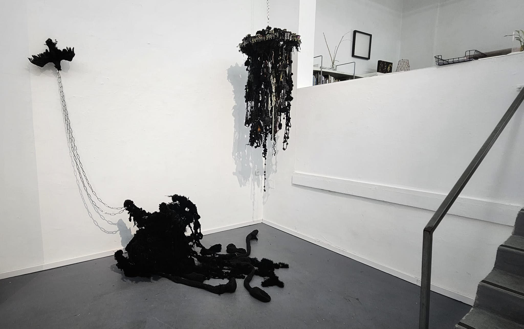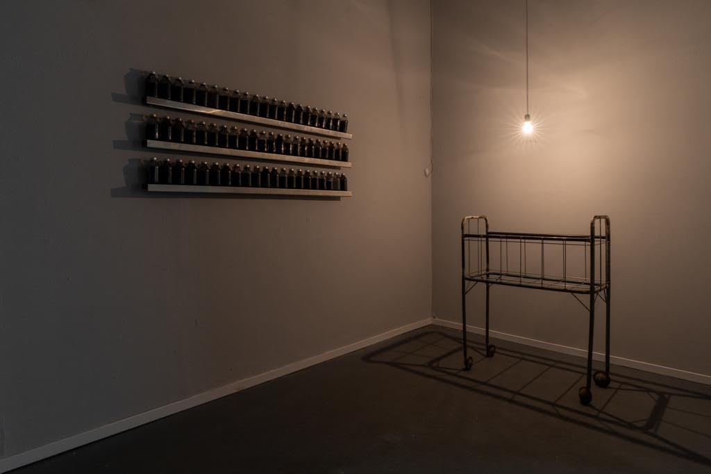בחלל הגלריה הפנימי הקטן העמידה האמנית בשורות "ממושטרות" כדבריה, בקבוקים אשר בעבר, נשאו תרופה שמטרת להילחם בפולשים לגוף חולה. בתערוכה זאת מהלתי בבקבוקי התרופה דיו שחור שמחקה את הזיכרון ואת העבר.