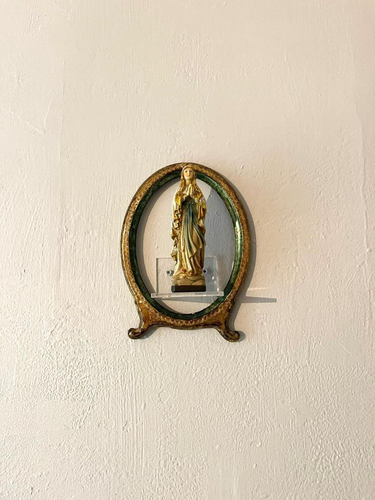 בפינת החדר מיטת ברזל ומעל המיטה מנורה עם אור חלש וענוג שמאיר את המיטה הריקה לרגע. אם מנדנדים את חבל המנורה המיטה הופכת לעריסה. בנוסף עומדת בפינת החדר המדונה ונושאת תפילה.