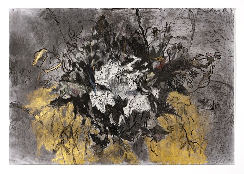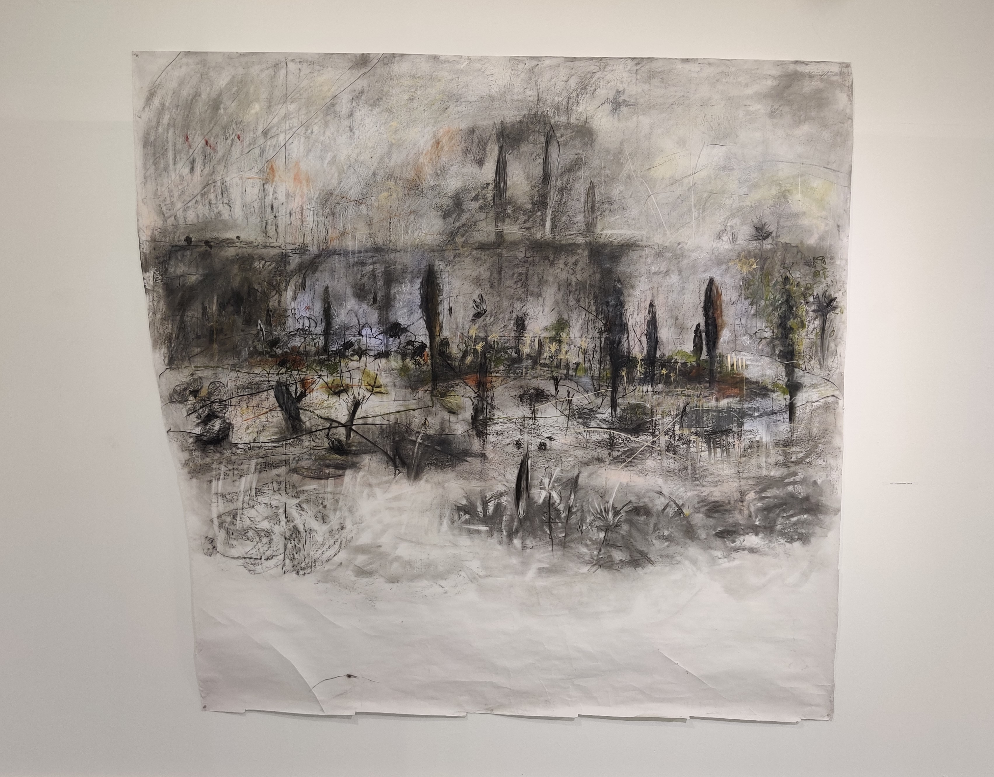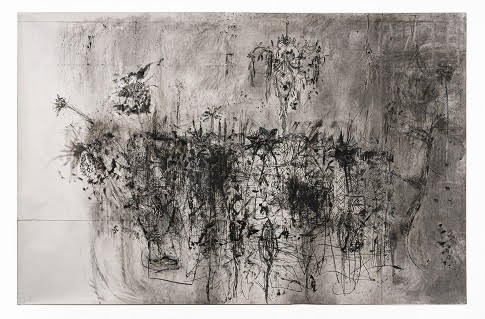 שולחן ערוך, 260 על 150, צבעי פחם ותחריט על נייר, 2022