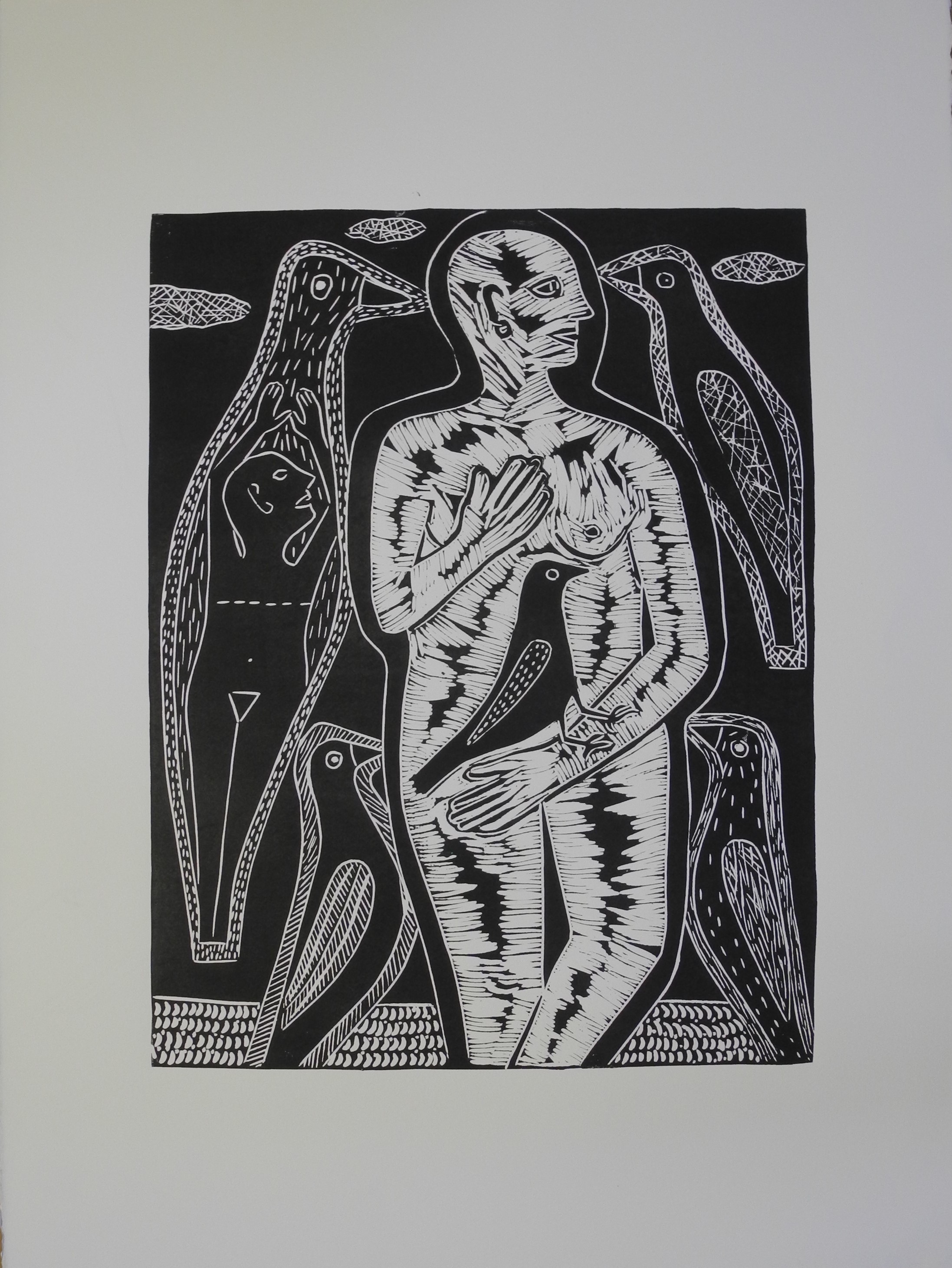 בתערוכה "ציפור, אישה, ברכה" המוצגת בבית האמנים מוצגות ציפורים ונשים בחיתוכי לינולאום בשחור לבן, הטכניקה העיקרית שבה האמנית יוצרת משנת 2017 לצד פיסול קרמי מוקדם.