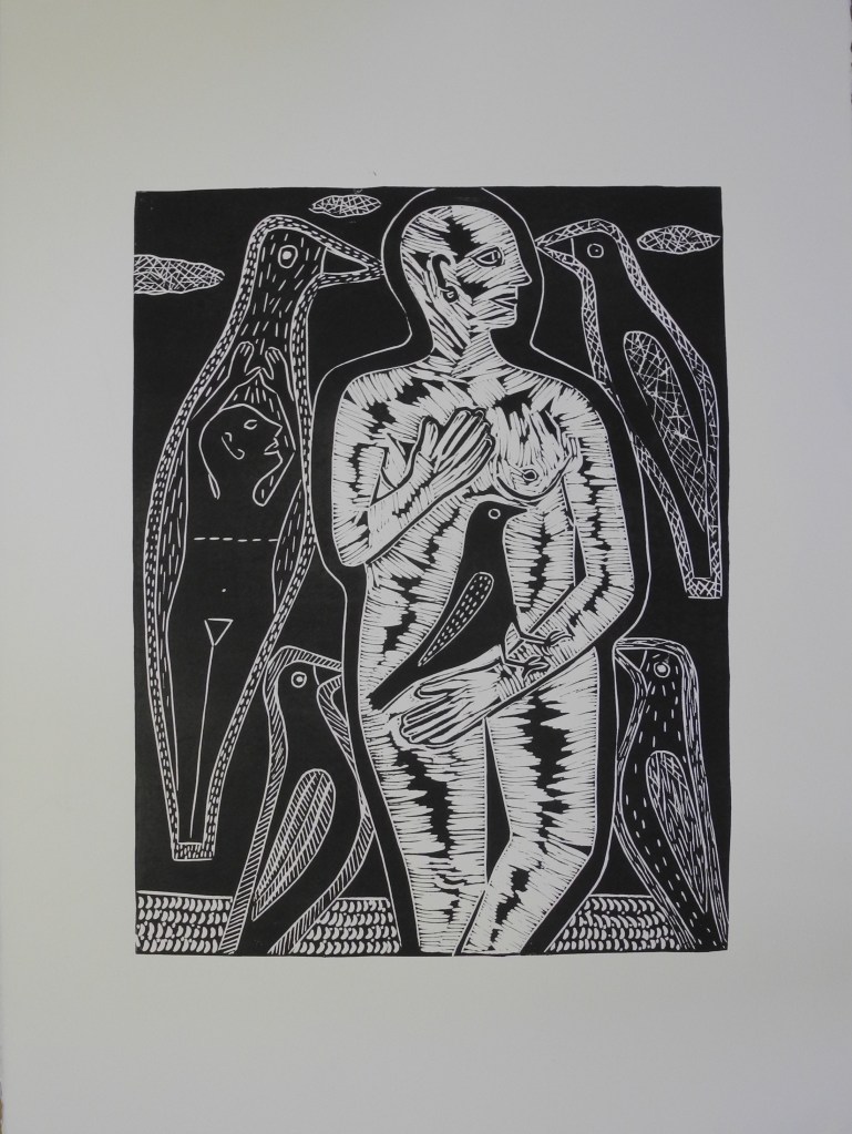 לעבודותיה של רעיה בר-אדון, התוודעתי בתערוכתה הקודמת- רעיה בר-אדון, "שיח אינטימי בשחור ולבן", גלריה לאמנות אום אל פחם, 2022. הקשרי נשים-ציפורים בחיתוכי הלינוליאום בשחור/לבן; המארג המעניין שיוצרים הקווקווים בדימויי הנשים ובציפורים המיתיים כאחד, והזיקה ביניהם.