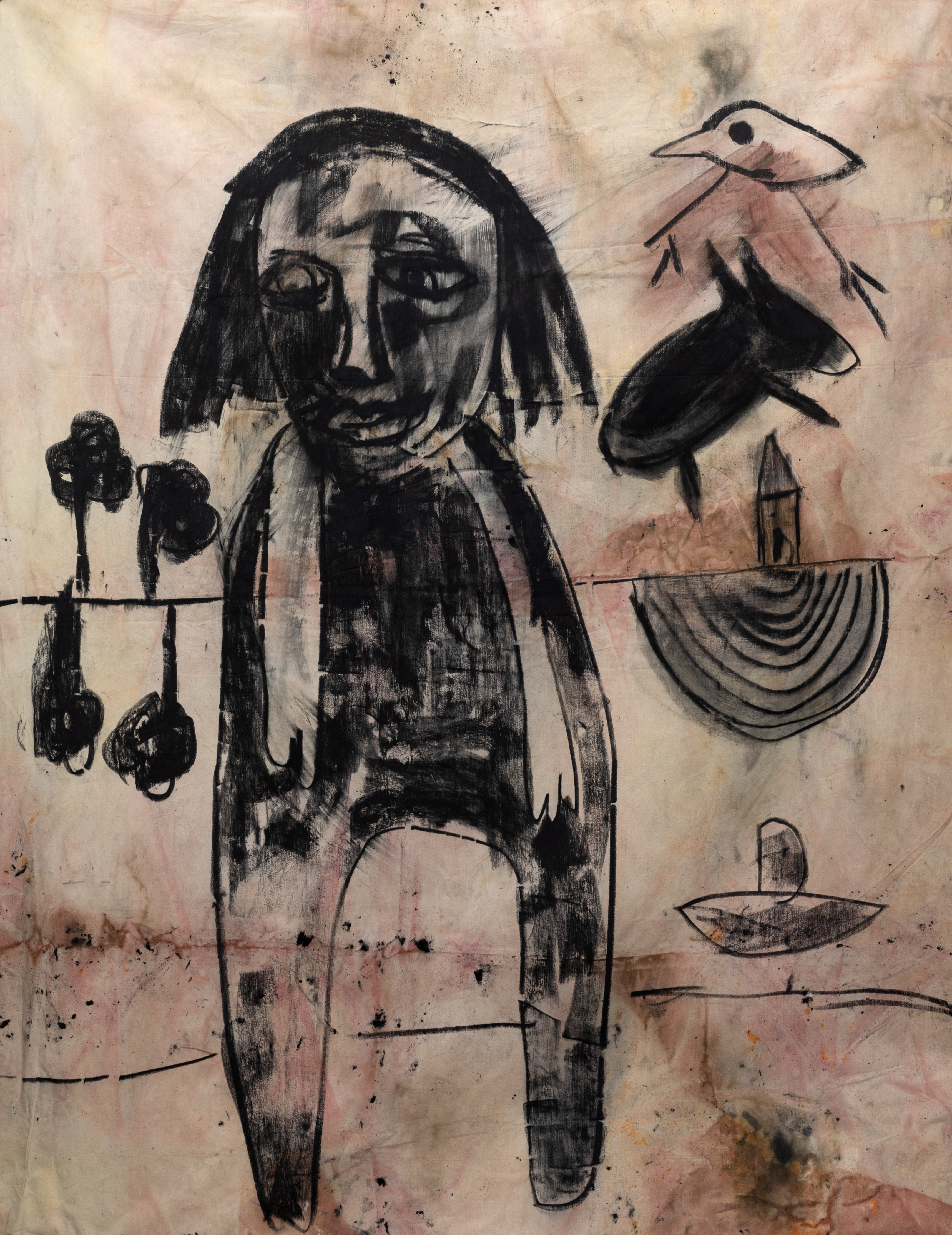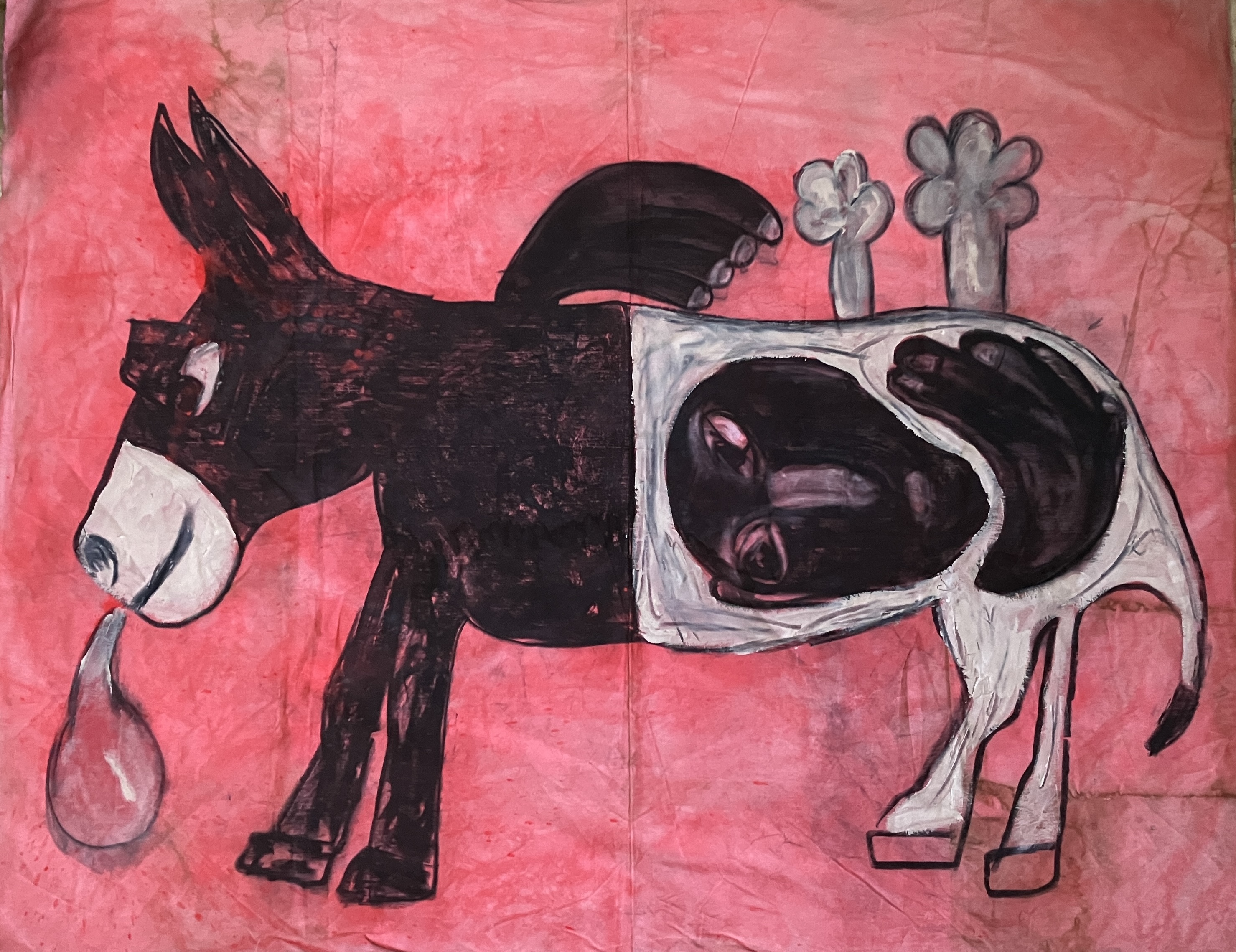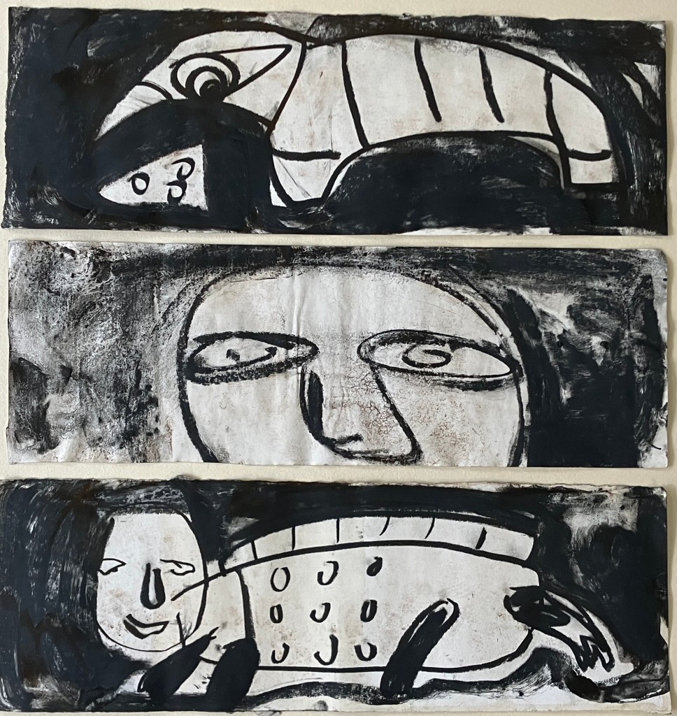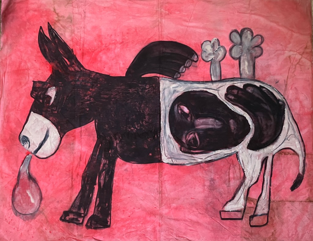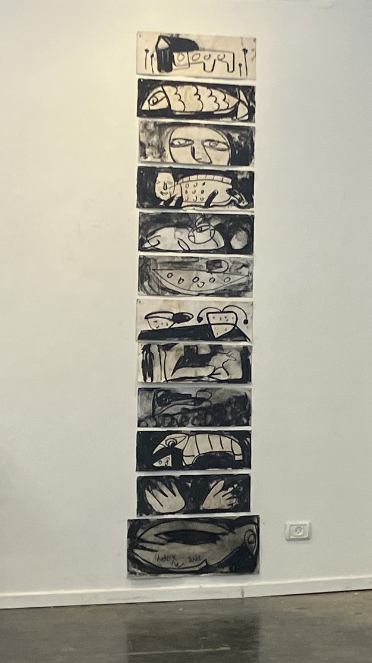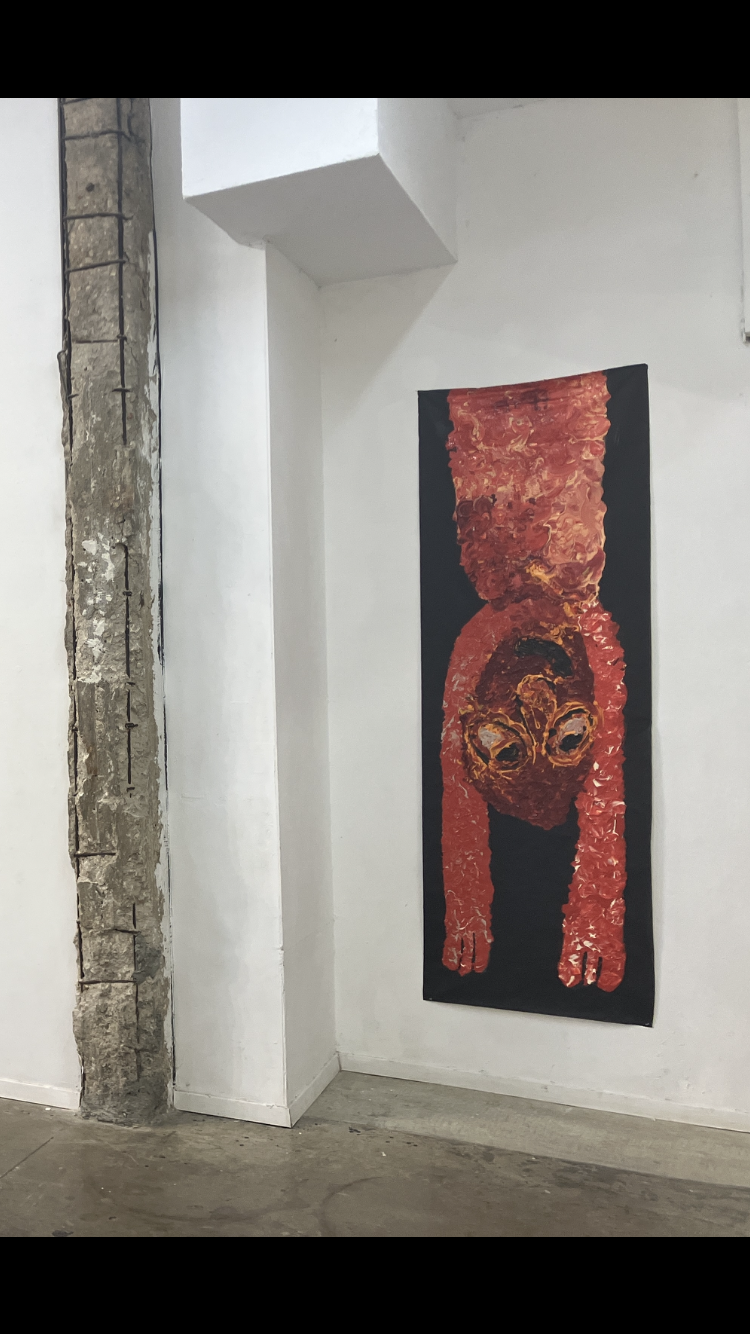 הביקור בתערוכה העלה בראשי אזכורים לאמנות ברוטלית ולאמנים כקרל אפל וז'אן דובופה, אך גם באשר למקומם של דמויות, חפצים ודימויי בעלי חיים ובעלי כנף – ארנב, ציפור, חמור, סירה המוצגים במקביל. עבודות בהן מופיעים יצורי כלאיים, זוחל ולו פני אנוש (עם חיוך קליל) ויצורים הכלואים בבטנם של בעלי החיים. הידיים המוצגות במעין תפילה, השמלה השחורה הנראית כנושאת את עקבות הגוף שלבש אותה, והמצע – הקרוע, מטולא, מוכתם הנושא עמו את עקבות הזמן…