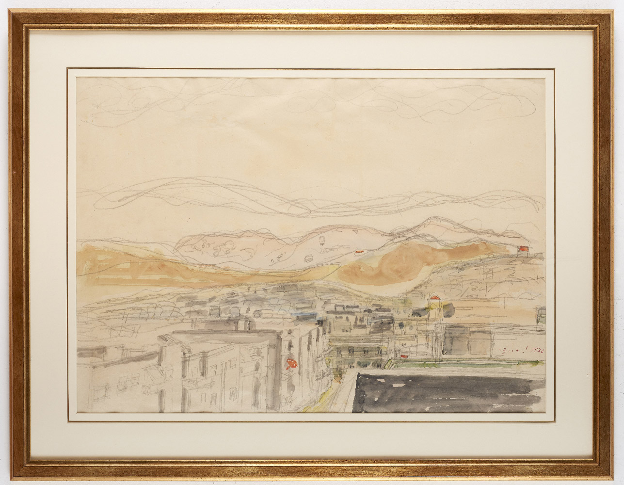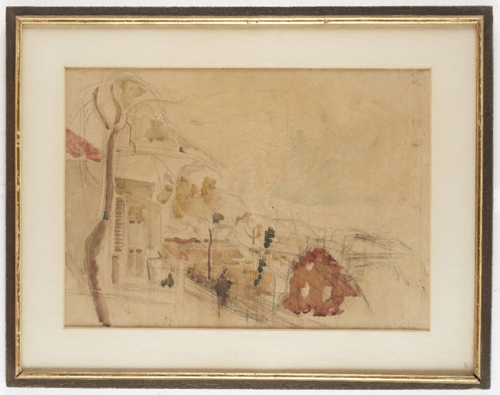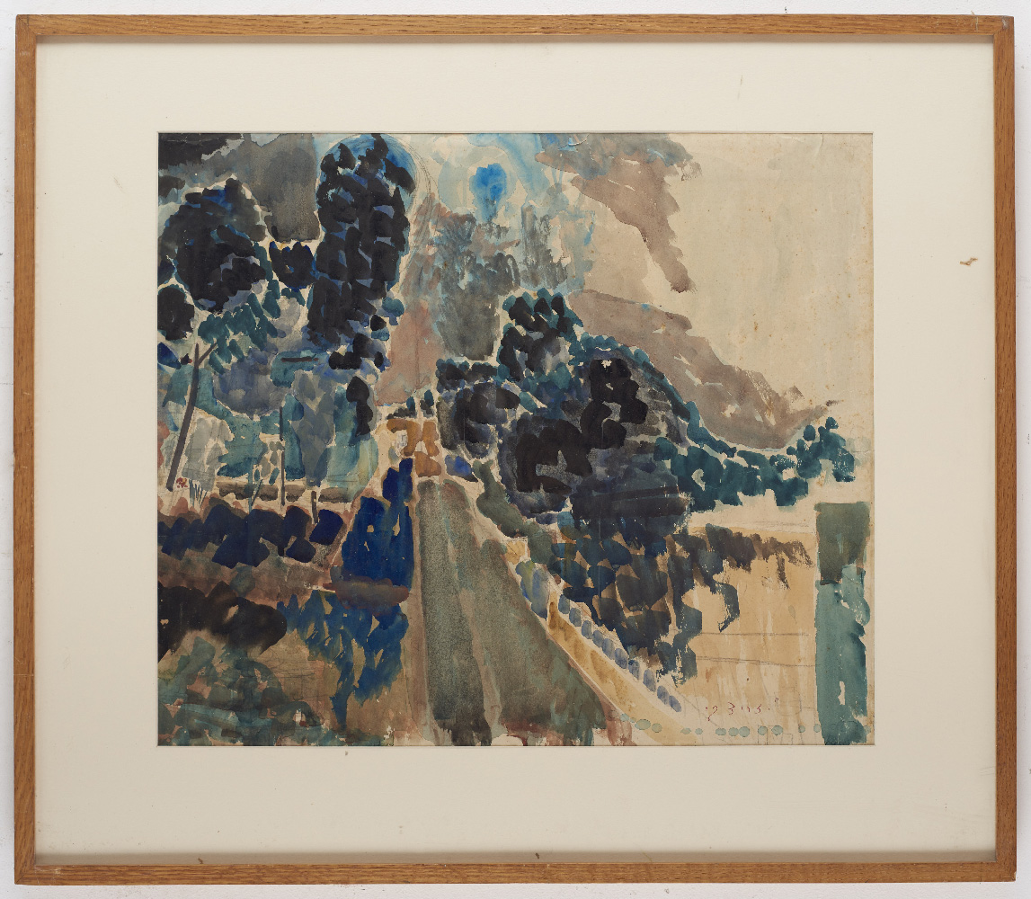 מימין, יוסף זריצקי, בית דר' טיכו, 1924, צבעי מים ועפרון על נייר; משמאל, יוסף זריצקי, נחלת שבעה, 1924, צבעי מים על נייר, אוסף גלריה אנגל