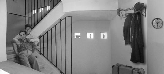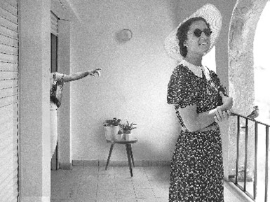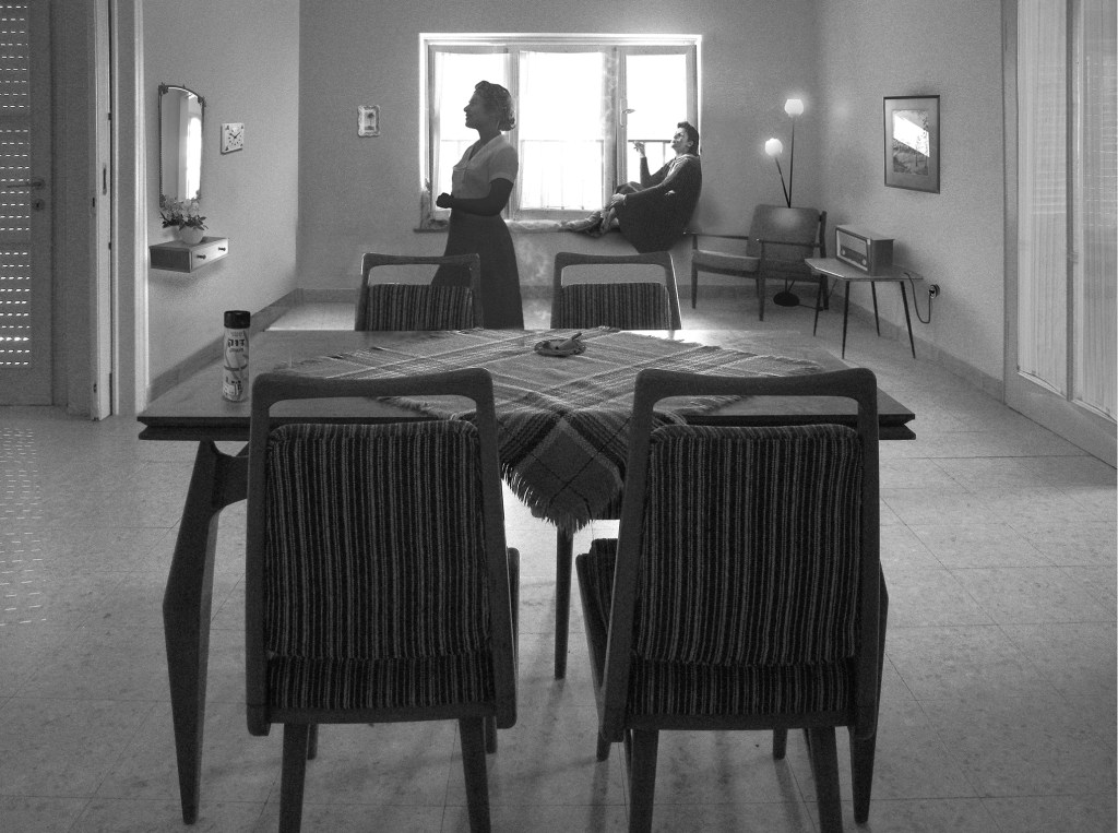 ראשית, ה- Mise-en-scène. בסדרת העבודות המוצגות בתערוכה נפלאה ומאתגרת עין זו שילבה אמיתי-טביב בין מבנה שהקים האדריכל אבא אלחנני לבין תצלומיו של הצלם דוד סרי. בתחילת דרכו כאדריכל (1947) אלחנני הוזמן לתכנן בית משפחה באחת מן הערים בפאתי תל-אביב. מבנה זה שימש במקור כבית מגורים, אך בשל גודלו, "נוכסו" חלקים ממנו ל"מלון" בו שהו נופשים, פצועי מלחמה, זוגות בירח-דבש וזוגות נוספים… סרי, צלם חובב, זכה לעדנה ניכרת ולהכרה, בשל איכות התצלומים.