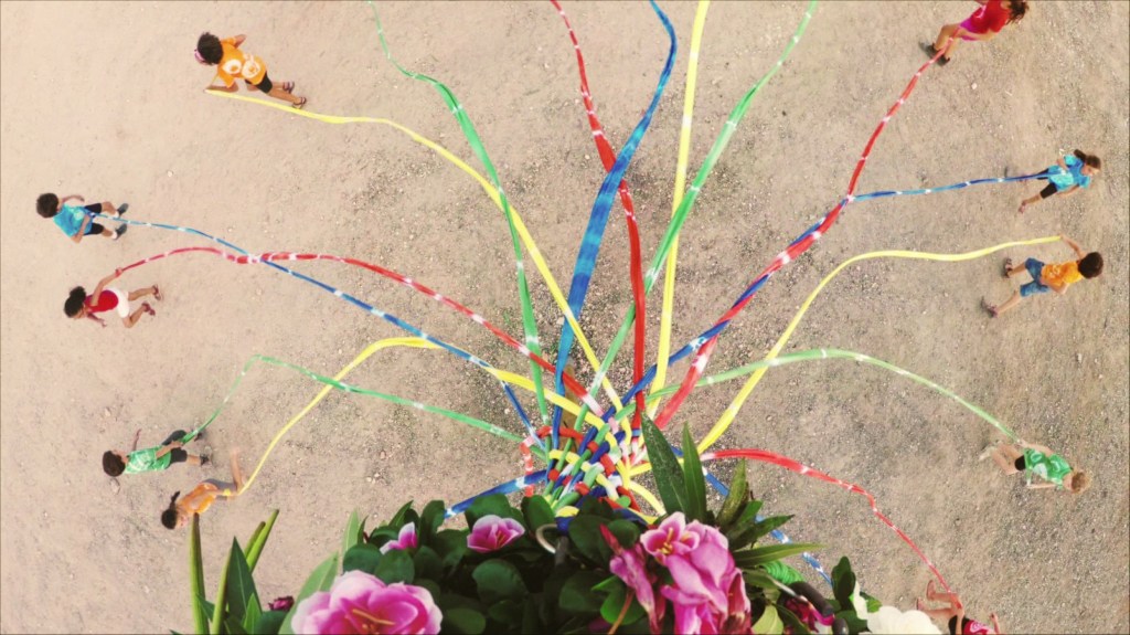 בעבודת הווידיאו של סיגלית לנדאו מוצגת קבוצת ילדים על סף גיל ההתבגרות הרוקדת בלא משים ריקוד טקסי פגני עתיק. הריקוד מחזורי ומתייחס לזמן מעגלי. כל ילד/ה מחזיק בידו סרט צבעוני שמחובר לעמוד במרכז המעגל. בכל סיבוב שהילדים משלימים, עוד פיסת בד נארגת סביב עמוד הטוטם. לאחר שהאריגה תושלם יגיע זמן הפרימה. (סיגלית לנדאו)
