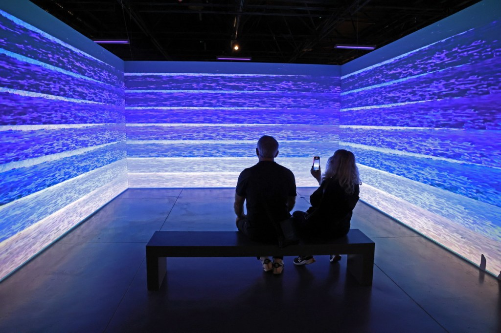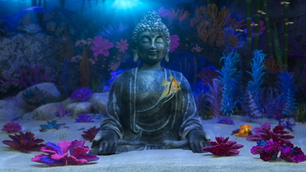 מיצב הווידיאו אנימציה של מירב הימן מדמה אקווריום גדול ממדים ובורא חיזיון תת מימי. המציע אלגוריה מחזורית ליחסים המורכבים בין האדם לטבע, התפעמות האדם מיופיו של הטבע והניכוס שלו מחד, ואת מחיר הזיהום וההרס של פעולות ניכוס אלה מנגד. בעבודה זו תפקידו של פסל הבודהה המזוהה במזרח עם החיפוש אחר שקט ושלווה, מייצג התרפקות על עולם שהיה ואיננו ועל עבר תרבותי עשיר, אך משמש בעצמו כחיקוי חומרי שנועד לקשט.