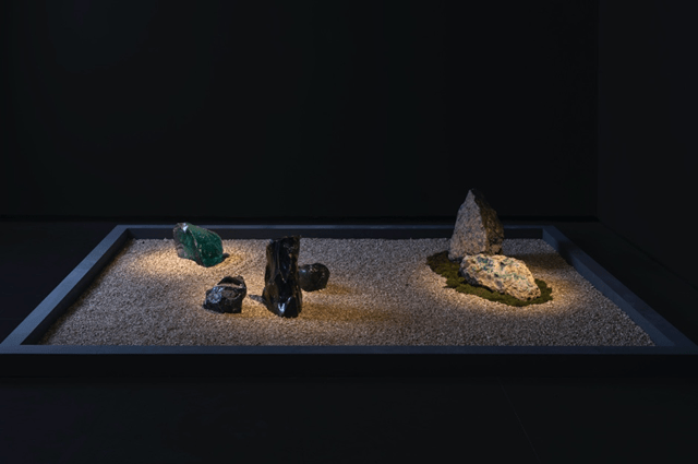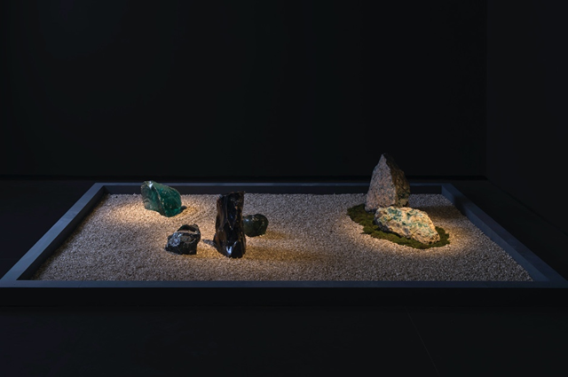 המיצב גן נוף יבש של הילה עמרם שואב את השראתו מגן הסלעים היפני המסורתי (גן זן), שנועד להשרות רוגע ושלווה. במקום סלעים טבעיים, עמרם משתמשת בגושי זכוכית גולמית שמקורם במתקנים לייצור זכוכית באפולוניה-ארסוף משלהי התקופה הביזנטית והתקופה האיסלאמית הקדומה (מאות 7-6 לספירה). אזוב מלאכותי עוטף את הגבישים.[3]