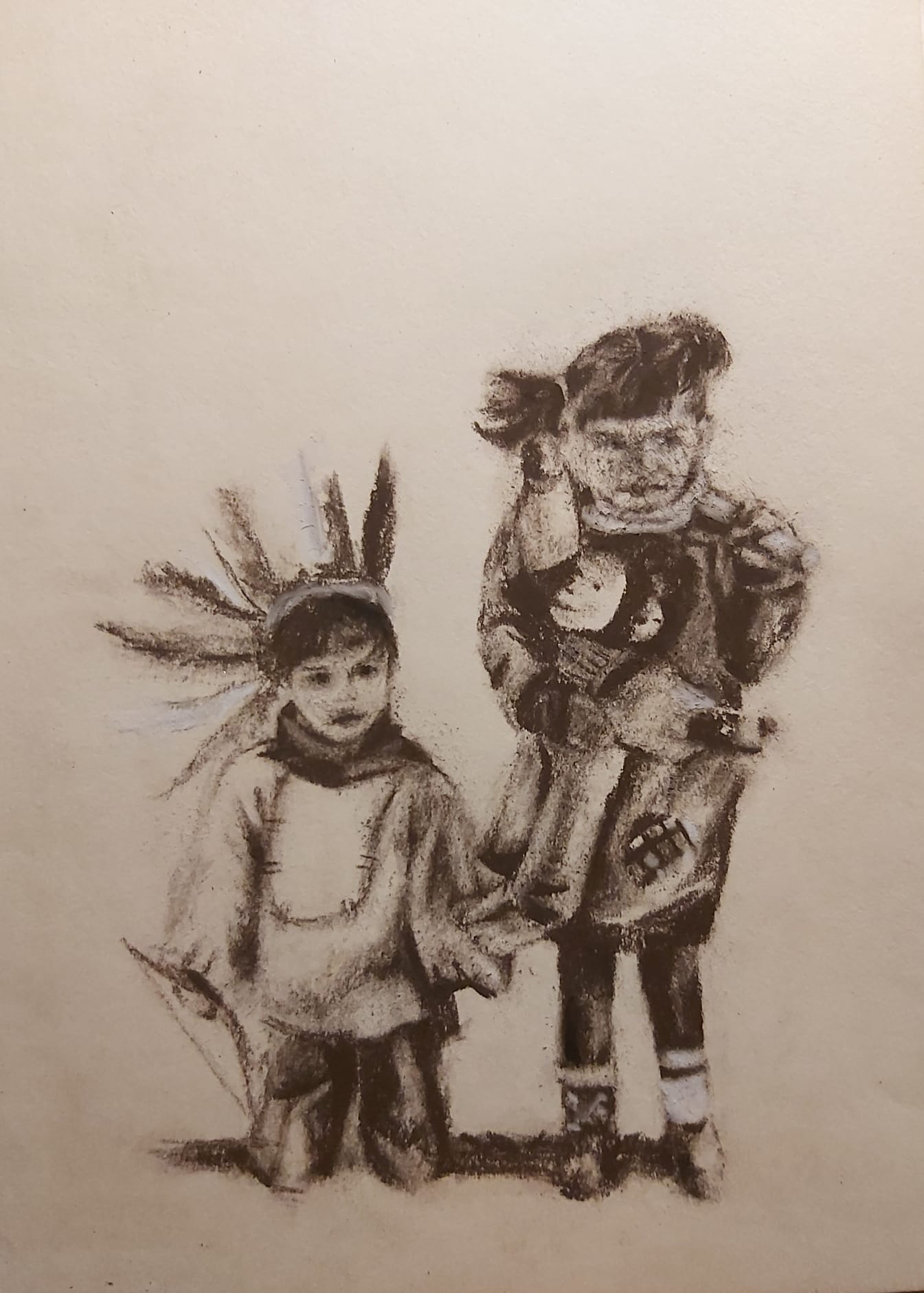 דנה מנור כהן, אחותי ואני/ My sister and I -פחם על נייר 2023