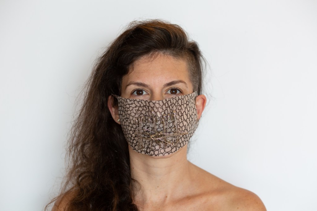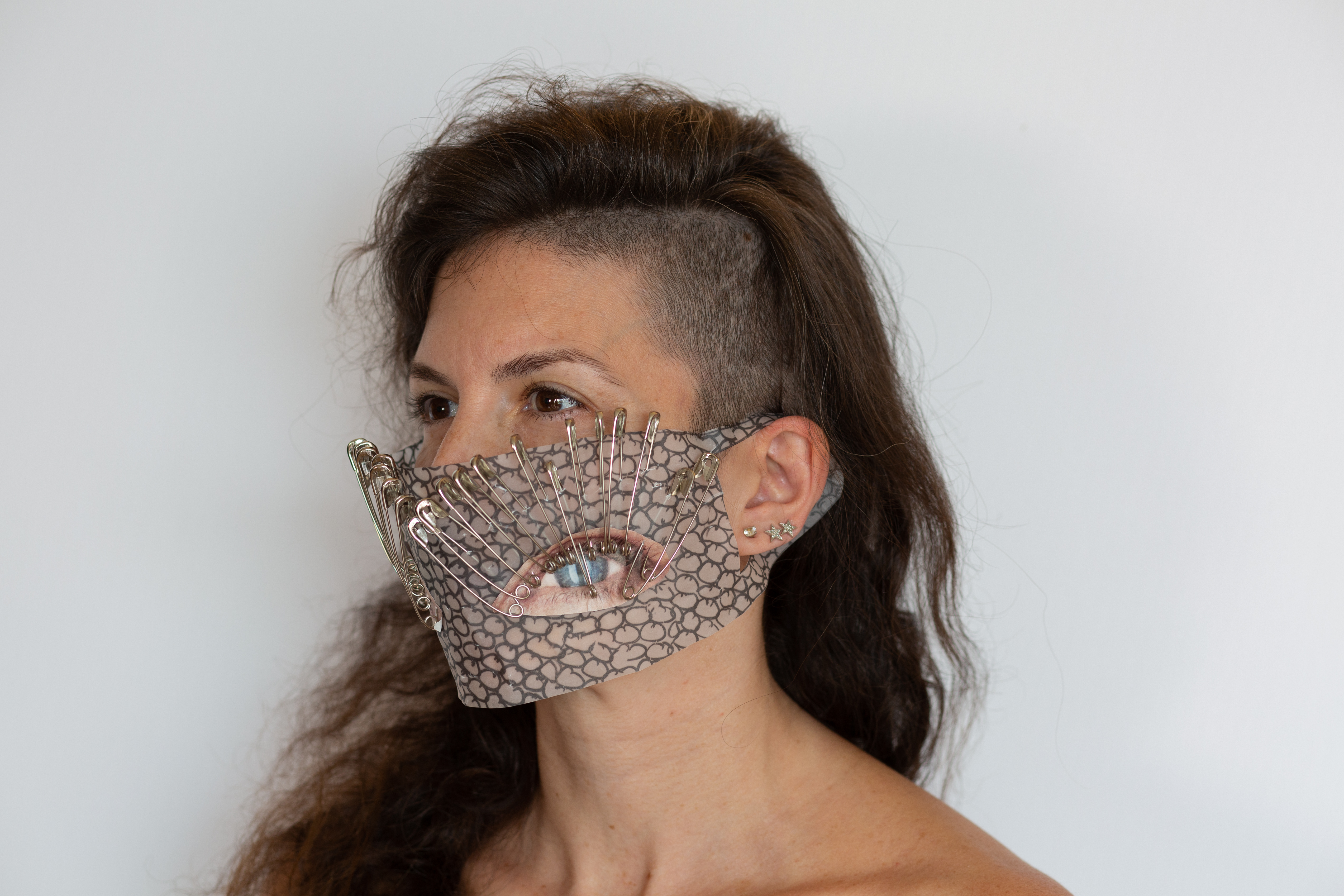 דניאל פלדהקר FACELESS, הדפסה דיגיטלית על נייר Fine Art, 2020 25×38 ס"מ סדרת הצילומים Faceless, מציינת האמנית דניאל פלדהקר בשיחה עמה, החלה בתקופת הקורונה. בתערוכה מוצגים צילומי פורטרט עצמי של האמנית, המוסתר בחלקו ע"י מסכה אותה יצרה. המסכות הן למעשה רישום שלה על נייר פרגמנט, כשלכך מתווסף פן עמלני ואישי. על חלקן רקמה, בחלקן הושמו סיכות בטחון במקום עיניים ופה, ויש שתפרה על העיניים והפה בחוטים, כאות להשתקה, ולחוסר האונים של הפרט. כמו כן צירפה לעתים עיניים שגזרה מעיתון, חוטי צמר ועוד. התוצר המתקבל, מסכה העשויה בצפיפות ובעבודה עמלנית. פלדהקר ציינה שיש מסכות שבחרה להציג כאובייקטים, ועם חלקן הצטלמה.