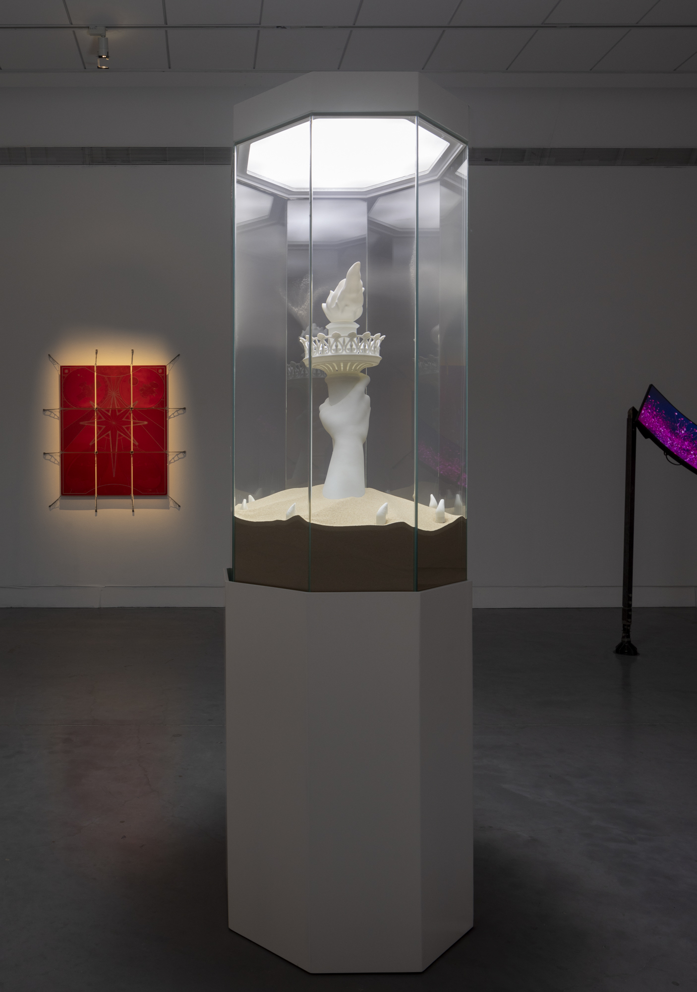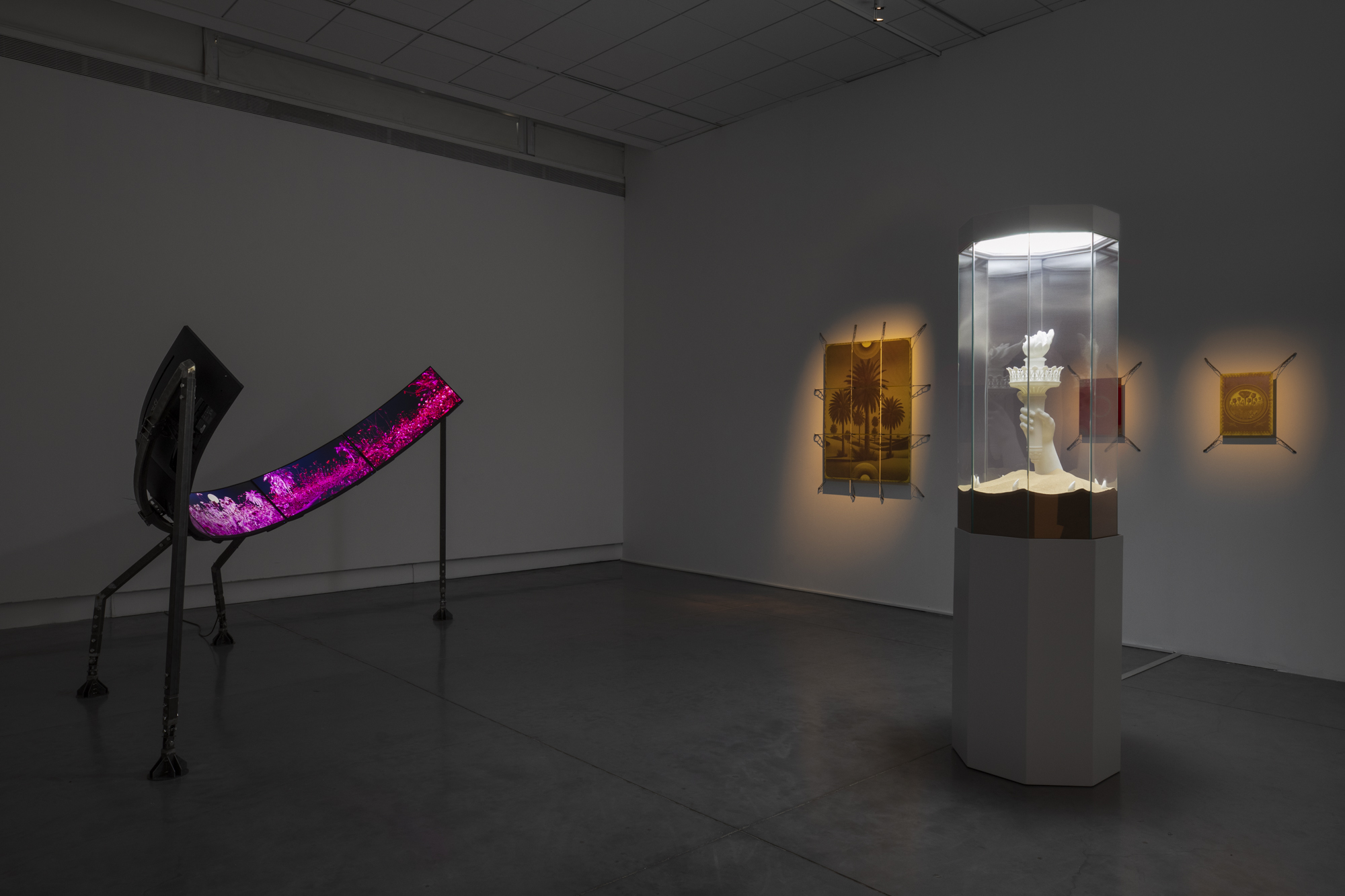 במרכז תערוכתו של מור אפגין יד פלסטיק אוחזת בלפיד – העתק של פסל החירות. סביב היד מתחוללות סופות חול מתוזמנות מראש, שבכל הפעלה שוחקות את האובייקט. בחלל מוצבת גם סדרה של לוחות אלקטרוניים, ועליהם תמהיל של דימויים וסמלים המאזכרים שטיחי מלחמה אפגניים. "שטיחי המלחמה" רווחו באפגניסטן בשנות ה-80 של המאה ה-20 ותיארו סצנות משדה הקרב – כלי נשק, חיילים מסתערים וסמלים צבאיים. האייקונים הדיגיטליים ואותות המלחמה שעל הלוחות מצייתים לתבניות קידוד שמקורן בכרזות תעמולה, ליצירת הירוגליפים עכשוויים.