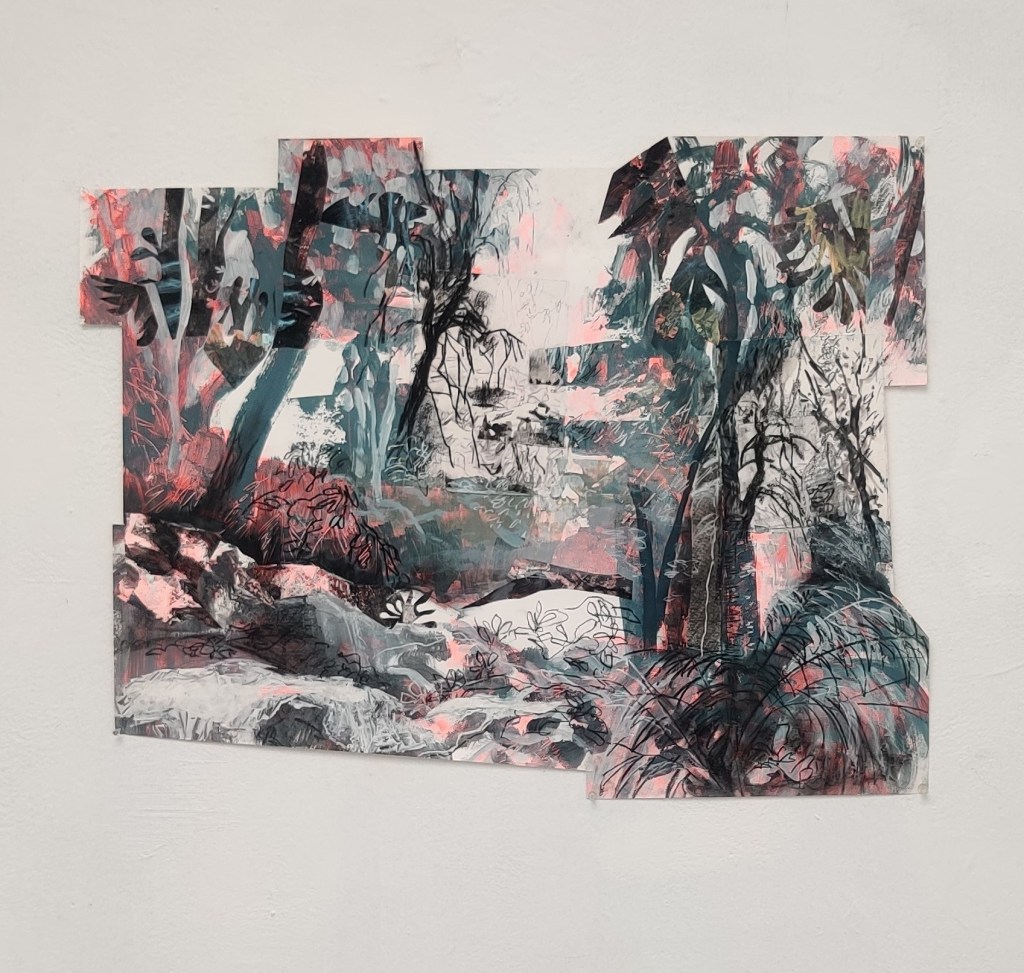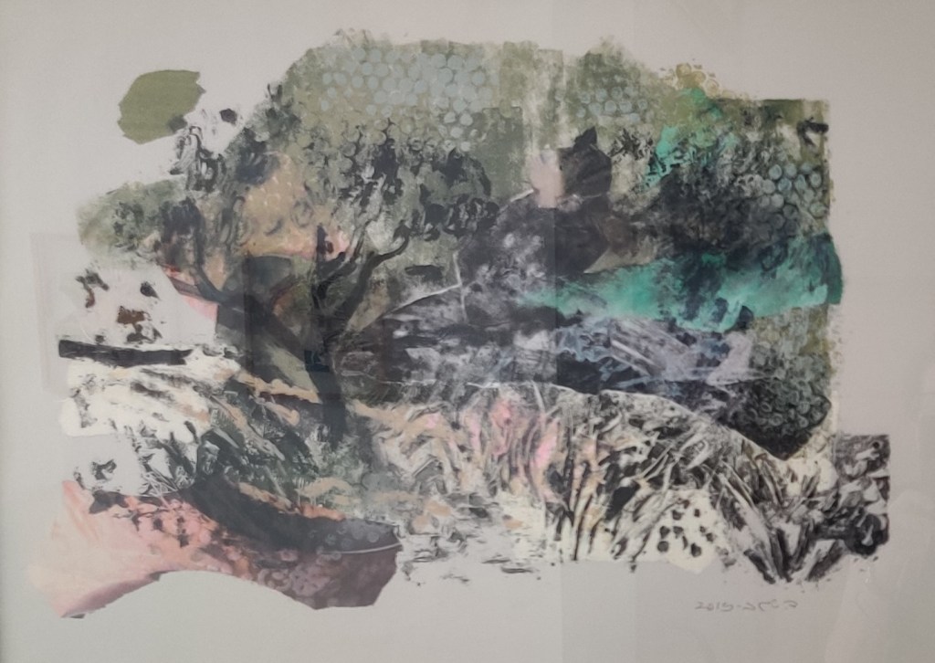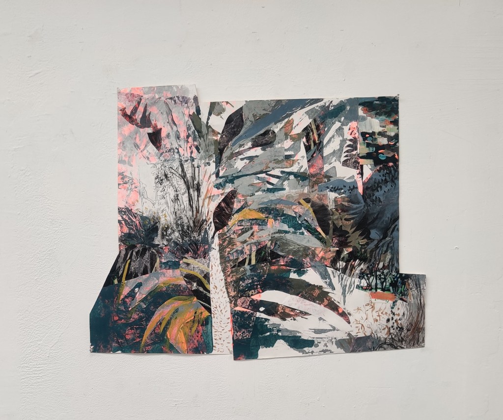 דליה שגב מציגה עבודות הדפס מגוונות משולבות בקולאז'. העבודות עוסקות בנוף מקומי, פסטורלי לכאורה, ומנגד הנוף המוצג מפורק לפיסות ולצורות מופשטות.