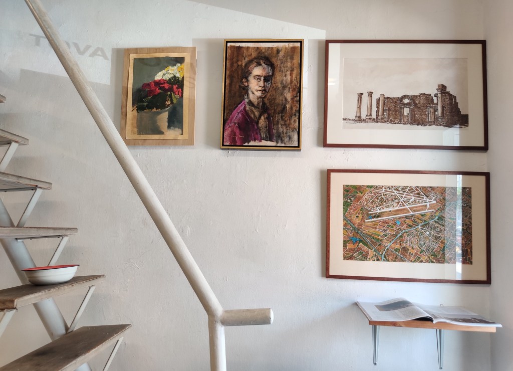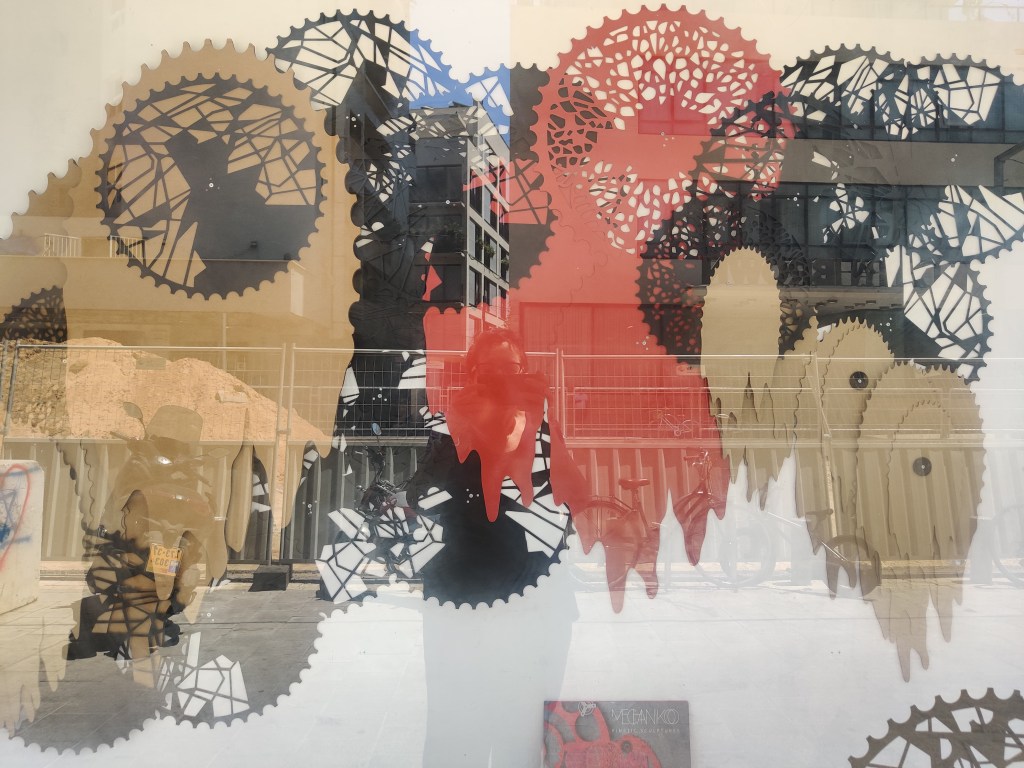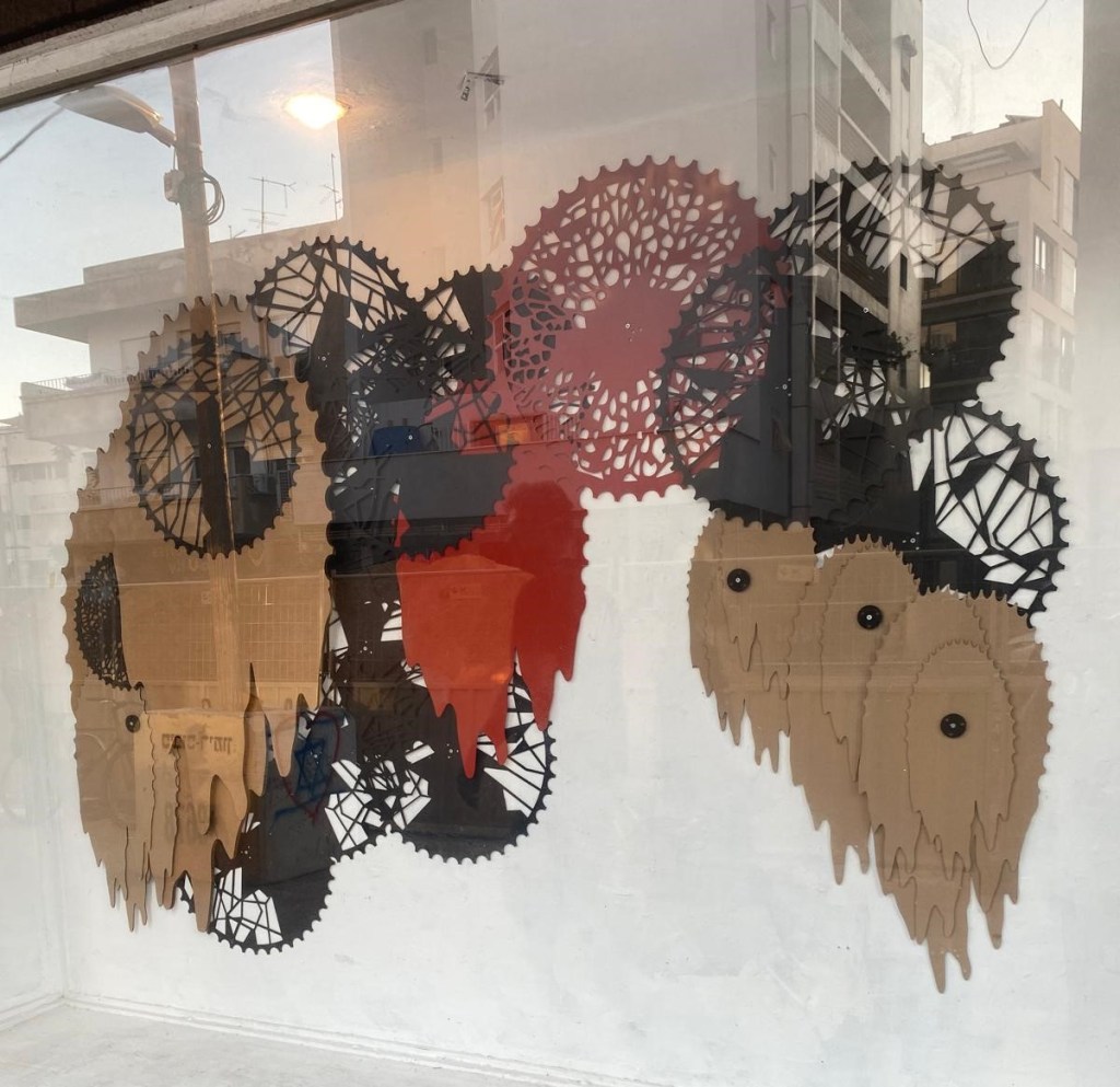 בחלון הגלריה מוצג מיצב של אילן הלחמי. טובה אוסמן ציינה בשיחה עמה שזהו מיצב שני של אילן הלחמי, אמן/אדריכל המוצג בחלון הגלריה. החומרים בהם בנה את המיצב הם אלומיניום צבוע באדום וחתוך בלייזר וקרטונים אותם הוא רושם במחשב וחותך בלייזר. דימויי גלגלי שיניים הם באנלוגיה לגלגלי זמן כדבריה, ודימוי הקרטונים הנוזליים בצורתם אף הוא מביע את הזמן החולף.[9]
