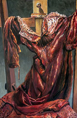 צליבה – כן ציור/צלב, שמלה אדומה המסמנת ומסמלת את מדגמי הגוף שלבש אותה. ציור אקספרסיבי במאוד בו ניתן דגש לקפלים, לאור המאיר העולה מהם, ומנגד לנפילה שלהם ולתעתוע בעין (לפחות שלי) באשר לכן ציור שמאזכר צלב/צליבה.
