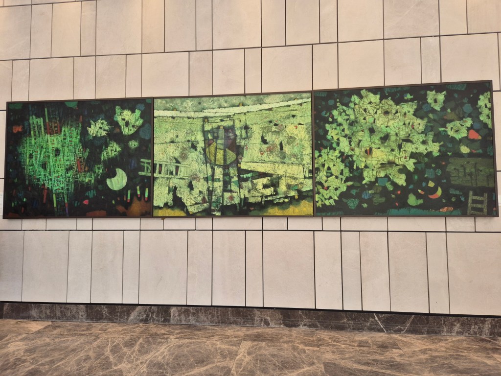 נטליה זורבובה, חדר מגורים, 2024, שמן על בד שי אזולאי, איש עובד, 2014 שמן על בד