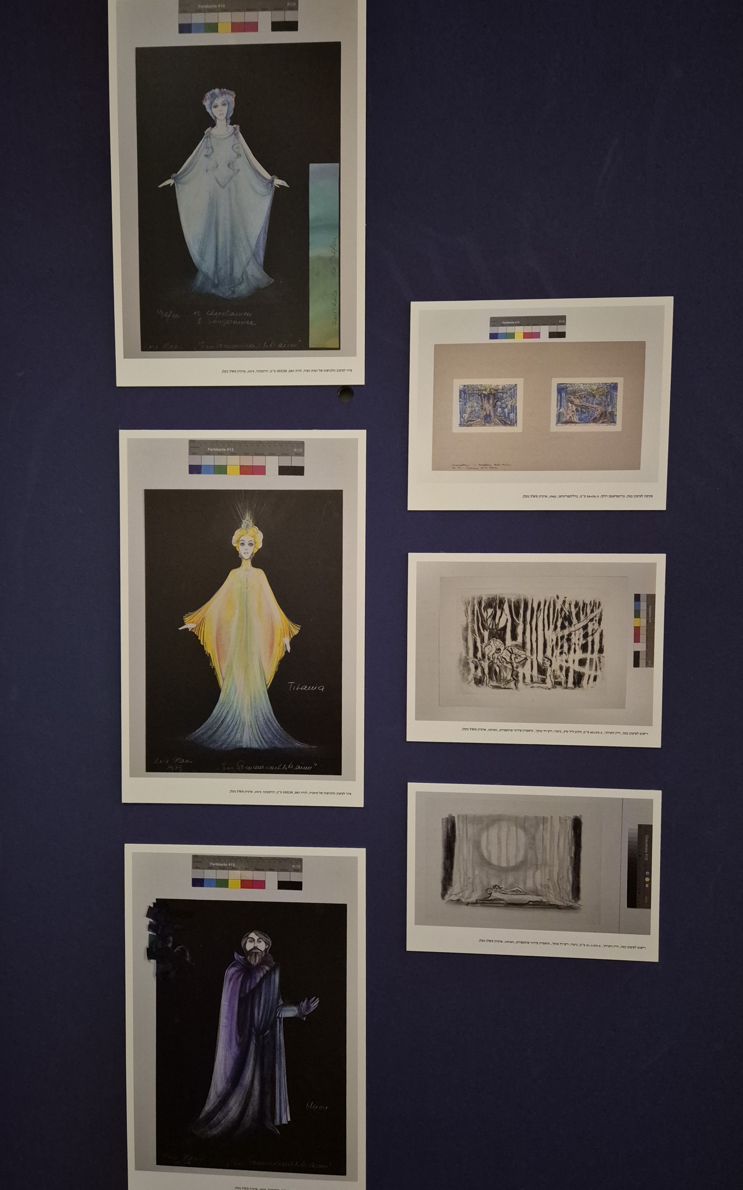 מימין עבודות לעיצוב במה, משמאל, סקיצות לעיצוב תלבושות